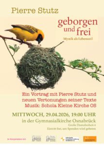 Mittwoch, 29. April 2026, 19:00 Uhr in der Kleinen KircheGeborgen und frei. Mystik als Lebensstil – ein Vortrag mit Pierre Stutz und neuen Vertonungen seiner Texte. Die Schola der Kleinen Kirche Osnabrück unter der Leitung von Kerstin Hake gestaltet diesen besonderen Abend mit. Weitere Informationen hier: Geborgen und frei Mystik als Lebensstil.